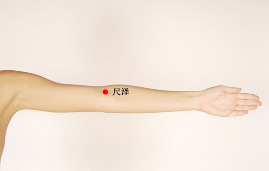 尺泽穴位于肘横纹中,肱二头肌腱桡侧凹陷处。按摩穴位时将掌心向上,手臂上抬,手臂内侧中央处有粗腱,腱的外侧处即为尺泽穴。
