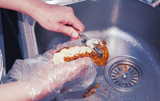 带皮的山药上有很多须,削皮的时候这些须会减慢削皮的速度,先把山药放火上迅速的过一下,烧掉上面的须,这样削皮变快了,也减少了与空气接触的时间。
