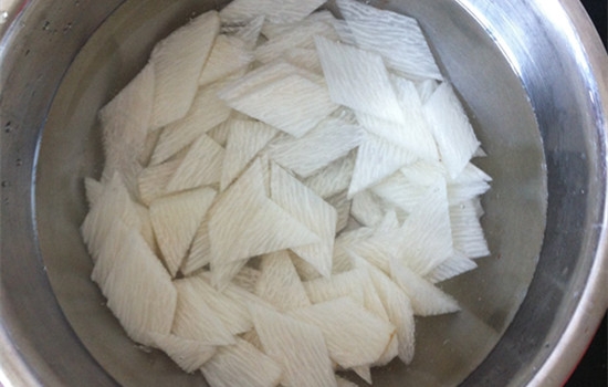 把去皮后的山药放进盐水里完全浸泡,这样山药就不会再变黄或变黑了。