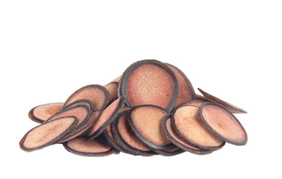 假鹿茸片似圆形,厚薄不均,直径一般在1.5至3.5cm左右,切断面多为棕紫色,且无蜂窝状细孔,偶有圆点。