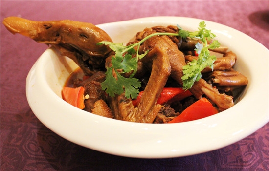 ④在原汤中加入鸡油、淀粉调汁,浇于鸭上即可。