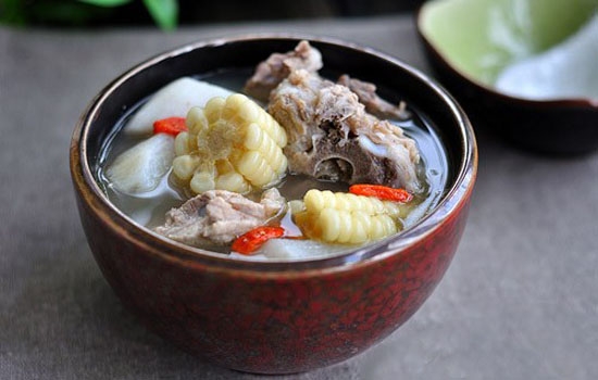 原料:猪脊骨适量、山药适量、嫩玉米适量、桂皮适量、生姜适量、香叶适量、枸杞适量、精盐适量。