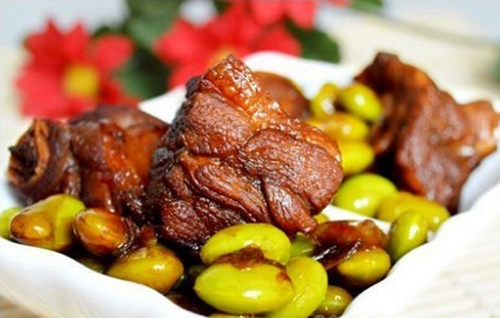 4.焖至剩1/3的水量时,加入毛豆米大火烧开后,转小火再烧10分钟左右。最后打开锅盖大火收汁即可。