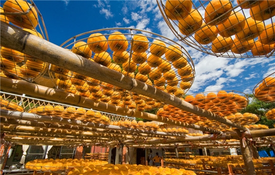 ②选择一个通风好、环境卫生的地方,在光照强的太阳天将去皮的柿子铺好暴晒,果顶朝上;