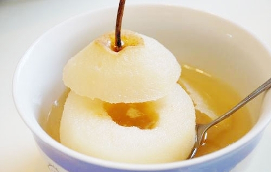 做法:将雪梨洗净,去皮去核,从上剖开;然后填入川贝粉、冰糖,再合起雪梨,隔水蒸半小时即可。