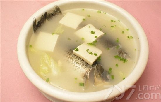 材料:鲫鱼1条(约150克),豆腐2块(约100克)、生石膏25克(可不放)。