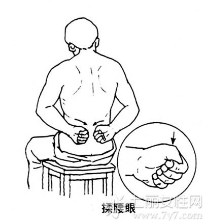 首先两手对搓发热后,紧按腰眼处,稍停片刻后用力向下搓到尾骨部位,连续做50次,每天早晚各1次。而后两手轻握拳,用拳眼或拳背旋转按摩腰眼处,每次5分钟。常做此法可强肾泻火。