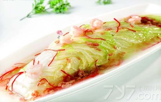 原料:白菜300克,虾米10克,菜油、水豆粉、葱、盐、味精各适量。