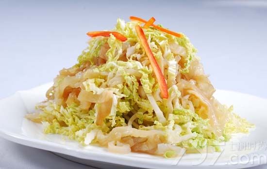 做法:将白菜嫩心切成细丝,加上少许盐腌制,然后将腌出的水分挤净;再加白糖、白醋、香油一起搅拌拌匀,装盘后,当凉菜食用。