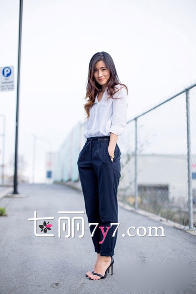 清新干净的白衬衫搭配深蓝色宽松九分裤,衬衫和裤脚都随意挽起,脚踝露出来,性感在不经意间。简练的时髦感奔涌而出,在夏日有很好的视觉降温的效果。