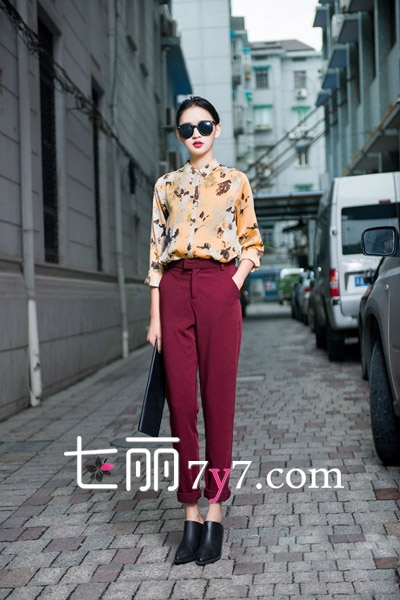 印花衬衫看上去略显老气,与酒红色九分裤搭配给人呈现出时髦感的复古风。独有的红唇妆更是气质优雅。黑色手包加上黑色尖头鞋更是气场强大,无可挑剔。