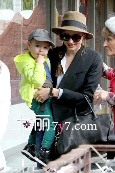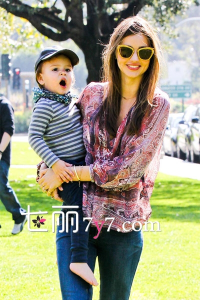 米兰达可儿手抱儿子Flynn,表情轻松自然,小弗里恩在妈妈怀里乖巧听话,萌态可掬。身着印花上衣搭配紧身裤,打扮极为简单。倒是儿子服饰搭配上的细节处理非常细心。