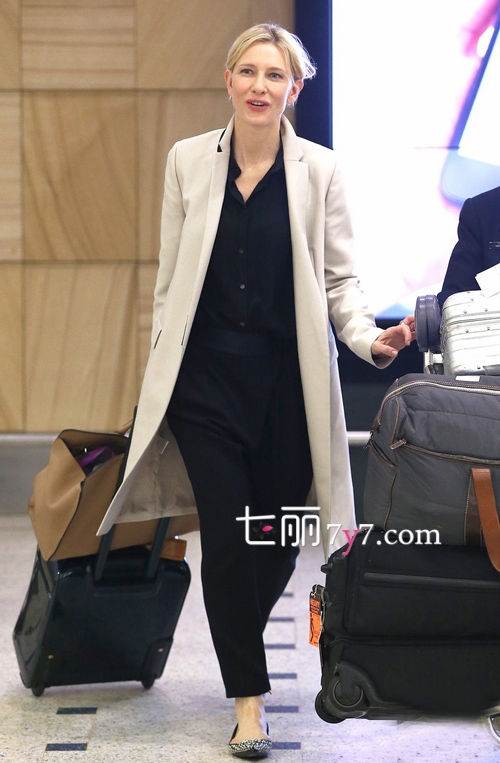 8月25日,凯特·布兰切特(Cate Blanchett)悉尼机场街拍,里面黑色一套,外披米白色风衣外套,脚踩舒适平底鞋,潇洒有型!