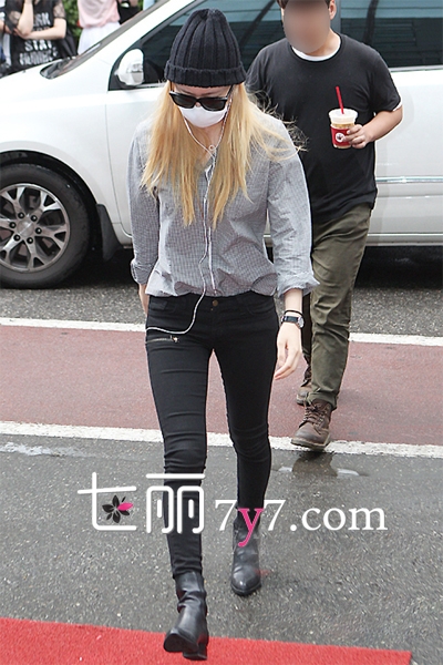 Krystal近日造型十分低调。简单的细格纹衬衫搭配黑色紧身仔裤,一头金黄的长发也用黑色的包子大面积遮住,用黑框墨镜和口罩遮住,完全看不到脸。
