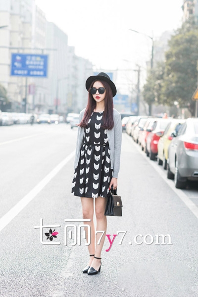 一身低调的造型也能玩转街头。黑色猫咪印花连衣裙简约甜美,搭着灰色针织开衫,配上红唇妆很是特别。黑色礼帽+黑色手提小包+黑色绑带高跟鞋,将整个造型打造出一种小女人的复古风味。