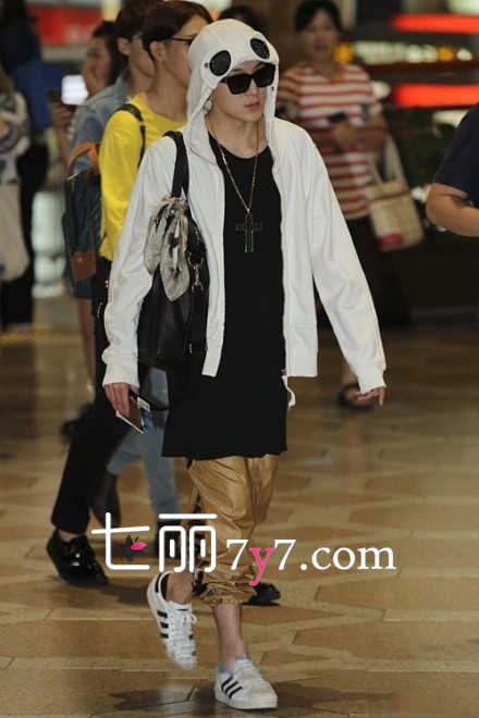 一身休闲混搭风格,超萌的白色外套内搭黑色长款T恤,金色运动休闲裤嘻哈风十足。最亮眼的要属黑色单肩包上的丝巾。