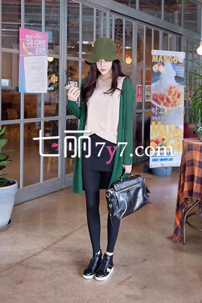 墨绿色长款针织开衫非常衬肤色。内搭米色字母T恤与黑色包臀裙打底裤,带有韩范儿的味道。整套服饰无论是搭配休闲鞋还是高跟鞋都完美融合。用一顶帽子凹造型,更加雅致清新。