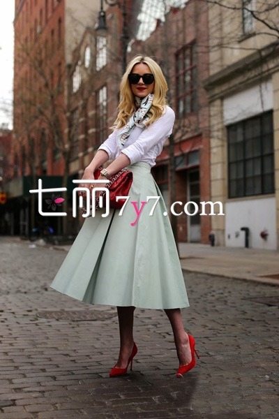 修身白衬衫是最常见的百搭基本款,搭配浅绿色褶皱高腰伞裙,突出纤细腰身,与裙身同色系的印花丝巾更添优雅气质。红色高跟鞋与红色链条手袋相互呼应点缀其中,凸显不凡品味。