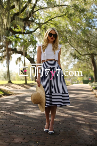 白色荷叶边短款上衣,娇俏可人,搭配着条纹高腰伞裙,尽显清新海军风。微露的马甲线,让博主看上去甜美中带有些许小性感,整体造型再搭配草帽,小长假就要这么穿。