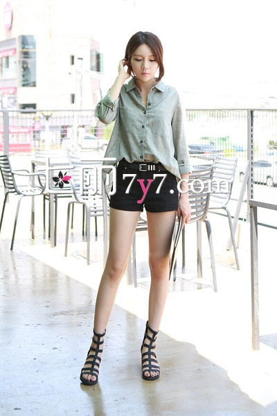 浅绿色宽松衬衫,棉麻布料轻飘舒适。黑色高腰热裤露出修长白皙的双腿。将上衣半束进热裤中,再用精致的腰带点缀,提升了不少造型时髦感。黑色罗马凉鞋是也不失为一亮点。整体造型搭配很有范。