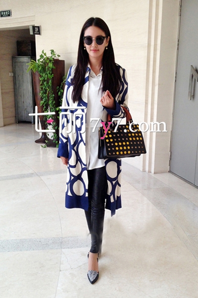 何穗最新街拍,灰色毛衣+墨绿色光泽感半裙,文艺慵懒,少女感十足。马海毛毛衣来自H&M,手提包和粉色毛拖鞋均来自Gucci,半裙来自Tibi 2016