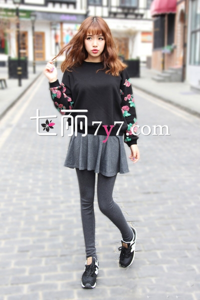 黑色印花上衣,袖子上的古典花朵刺绣看上去可爱又时尚,宽松版型能很好的遮挡身上的肉肉。搭配灰色褶皱高腰裙俏皮感十足,如果怕冷还可以在裙中加上一条同色系的打底裤。踩上一双运动鞋就能轻松出街赚回头率了。