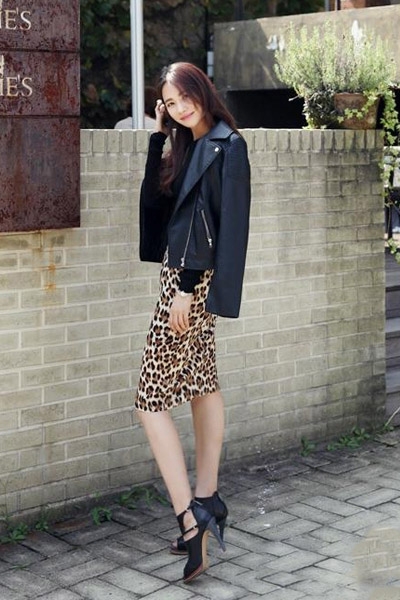豹纹元素一直给人一种狂野的感觉,只要有它的出现,总能有股强大的气场围绕在身边。黑色上衣搭配豹纹铅笔裙,充满了令人无法抗拒的女人味。外披黑色机车夹克,更加个性有范。细高跟鱼嘴鞋的加入,真是妙不可言。