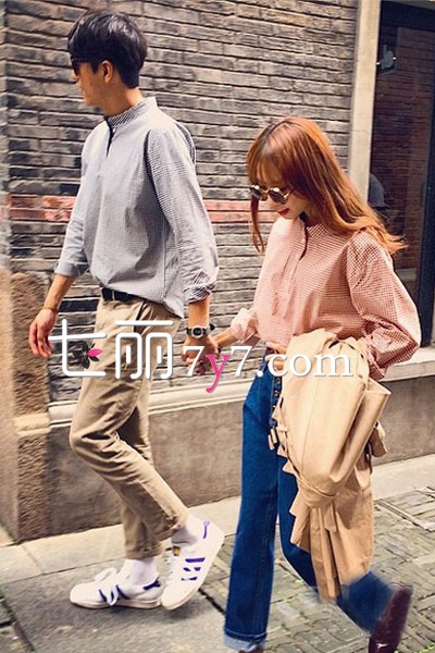 GG:浅灰色小格子衬衫搭配卡其色休闲裤,立领设计很有特色,不管男女穿了都好看,休闲中又不乏独有的时尚感。