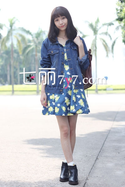 海蓝色印花连衣裙甜美可儿。白色与黄色的印花点缀裙身,倍感清新温和,似乎带来了春天般的气息,让人感受到生机勃勃。A字裙摆看上去俏皮活力。经典的仔衬衫一黑色短靴,随意而帅气,使女孩看上去极具个性。