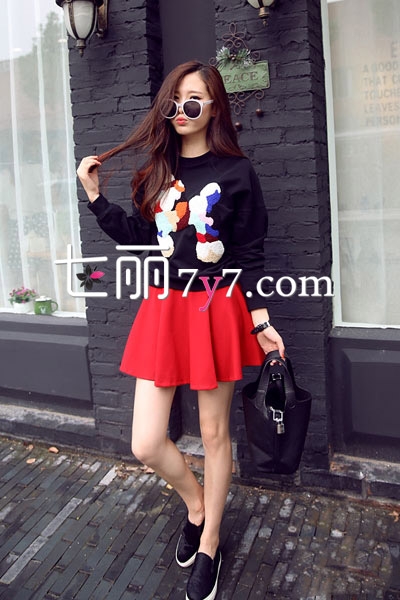 简约时髦的黑色套头印花卫衣,略微抽象的狗图案,采用多种颜色拼撞而成,却没有给人凌乱感。反之,明丽吸睛十分可爱。搭配亮眼的红色褶皱短裙与黑色休闲鞋,活力青春,似乎瞬间释放了MM内心火样的热情。