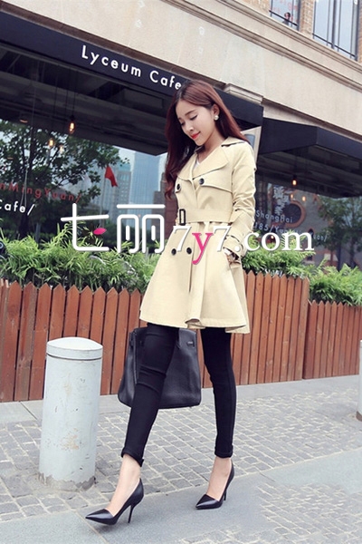 卡其色风衣外套,带给人优雅迷人的气质。双排扣与腰带的设计,是风衣的一大经典特点,让简单的款式变得时髦。收腰的处理,让身形更具线条感。裙摆款式,增添娇俏小女人味儿。搭配黑色紧身裤与黑色尖头高跟鞋,优雅大方有气质。
