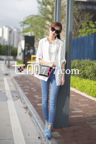 白色BF款宽松衬衫,单穿或是做外套都非常有型。MM较小的身材用来做外套尽显可爱气质。白色打底衫外搭白色长袖衬衫,穿起来清爽、自然,格外有味道。配紧身牛仔裤和运动鞋,舒适时尚,看上去很舒服。