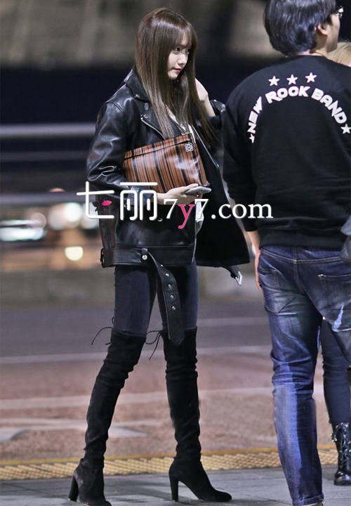 允儿一改往日清新简约风,帅气亮相。白色简单T恤加上深色紧身仔裤,外搭一件帅气的BF款机车皮衣,展示出不少时髦感。较小的个子在宽大的外套衬托下,然而更加楚楚动人。黑色过膝长裙凹造型,修饰出纤细修长的双腿,真是美极了。棕色竖条纹手包,更具时尚感。