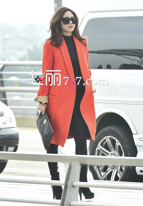 秀智貌似偏爱红唇妆,近日的街拍都能看到她的红唇妆,美美哒。宽松深褐色大衣外套,“睡袍”款式非常不合身,反倒展示出娇小可人的小女人妩媚气质。腰带修饰出身形,配上黑色铆钉短靴,产生酷酷的感觉。随意扎起的头发,与这身造型,给人呈现慵懒魅力。