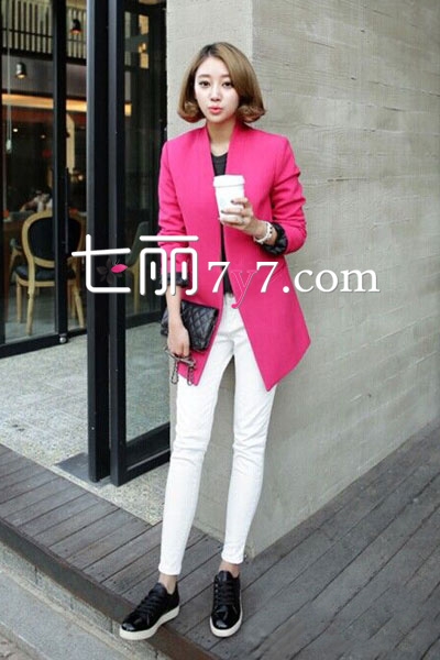 枚红色中长款西装外套,剪裁较为简单流畅,极具线条感,很好的修饰出身形,显得利落大方。枚红色鲜亮抢眼,很衬肤色。搭配黑色上衣加白色长裤,增添妩媚女人味和时髦感。