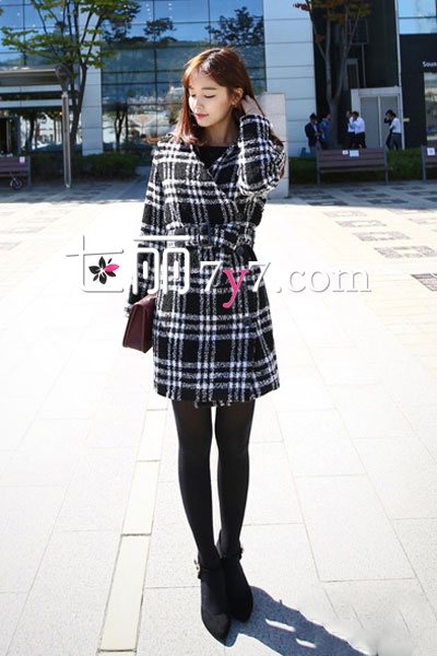 毛呢大衣外套,经典的黑白格子设计,很显优雅气质。简简单单的版型配上一根腰带,简洁又不乏大气之感。搭配黑色丝袜和黑色短靴,增添女人味,也很显瘦显高挑,给人呈现温婉淑女范儿。