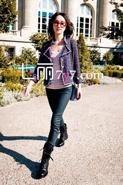 藕荷色打底衫,简单大方,宽领的设计,微露乳沟十分性感,垂感的面料看上去十分随性自然。外搭小香风格紫色粗花呢短款外套,与打底衣的同一色调,带有小女人味,显高又显气质。下装配上黑色紧身裤和马丁靴,不羁的帅气感凸显而出,很好的展示出个人的气质。