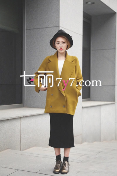 复古的泥黄色毛呢外套,宽松的版型加上大翻领设计,非常经典有型,上身给人呈现出文艺范儿。内搭白色针织衫,下装为黑色铅笔裙与金属色皮鞋,非常显气质,复古知性。