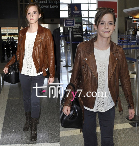 艾玛·沃特森(Emma Watson)机场街拍,身穿白色镂空上衣,外披一件棕色皮夹克,搭配深蓝色紧身牛仔裤,脚踩休闲短靴,干练帅气十足!
