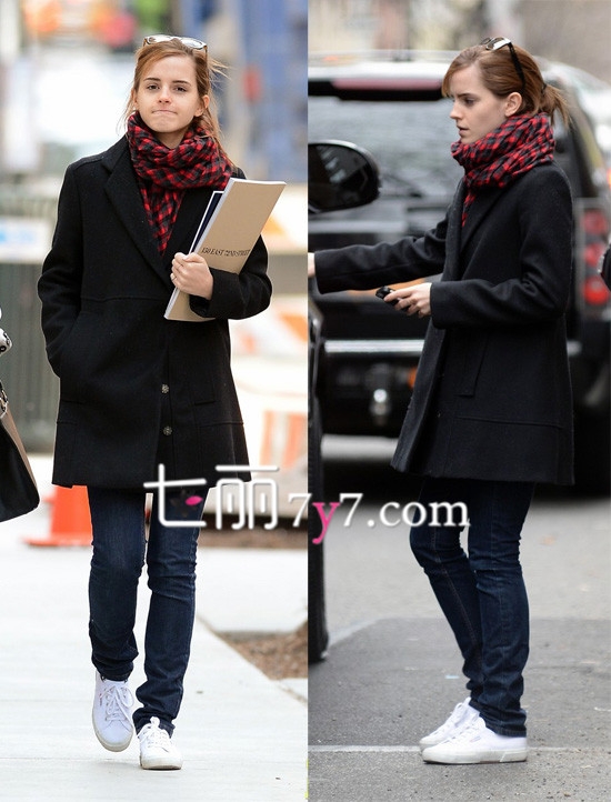 艾玛·沃特森(Emma Watson)校外街拍,身穿黑色呢子大衣搭配休闲牛仔裤,脚上一双白色平底休闲鞋。脖间格纹围巾即保暖又能起到装饰作用,手拿两本书学生气十足,不过也不乏时尚感。