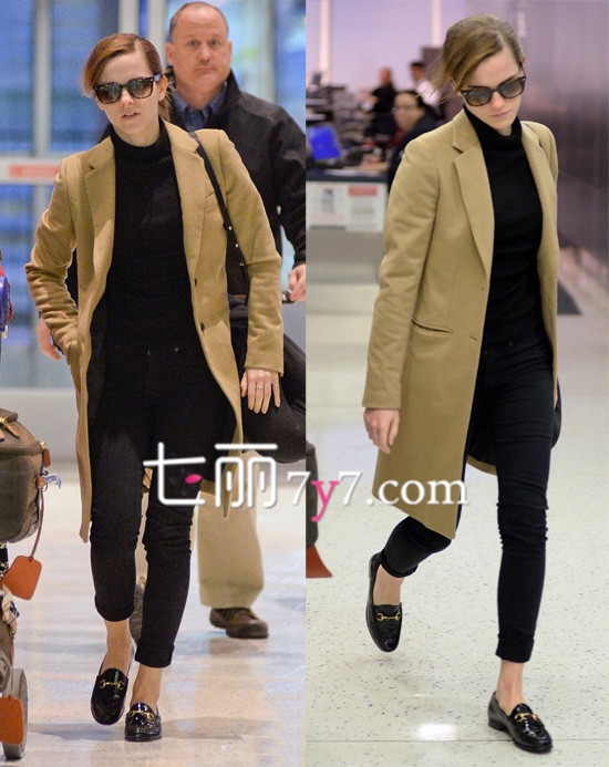 艾玛·沃特森机场街拍,黑色高领打底衫加黑色九分长裤,露出脚踝更显瘦。身披一件驼色风衣外套,加上黑色墨镜的装饰,时尚又拉风。