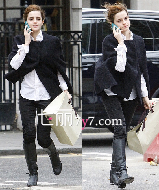 艾玛·沃特森生活街拍,身穿白色衬衫搭配黑色毛呢斗篷装,个性又别致。下面一条黑色紧身裤,脚踩中筒靴,整体时尚又显朝气。