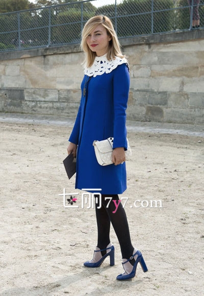 有一种蓝,沉静而优雅,非常地显气质,它就是宝蓝。这件宝蓝色毛呢外套,修身的轮廓如量身定做般。搭配白色镂空衣领非常的别致,下面简单搭配一条黑色打底裤,脚上的高跟鞋和手上的包包分别与衣服和衣领相呼应,整体异常的优雅复古。