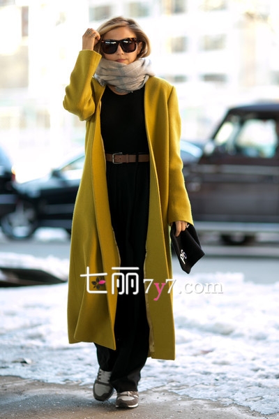 黑色打底衫和长裤,外披一件黄绿色风衣外套,非常的带感。腰间一条皮带显示出上下身材比例,时尚围巾和墨镜装饰,一副明星大牌范。脚踩运动鞋,这种优雅与休闲相结合的搭配是今年非常流行的。