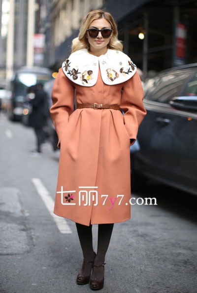 皮粉色大衣外套甜美衬肤,巨大的白色绣花衣领彰显的是别致与个性美,腰间一条皮带,修饰出上下身材比例,配上打底裤和高跟鞋,时尚名媛范十足!