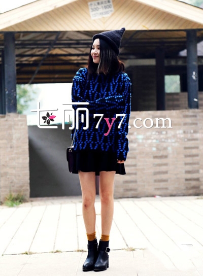 几何图案的套头毛衣,宽大的设计,看上去厚实温暖,质感十足,宝蓝色与黑色的相撞,打造出冷艳的格调。再搭配上一条黑色短裙,瞬间变得活泼可爱。黑色短靴与尖尖帽让造型更时髦,更有看点。