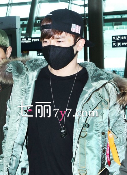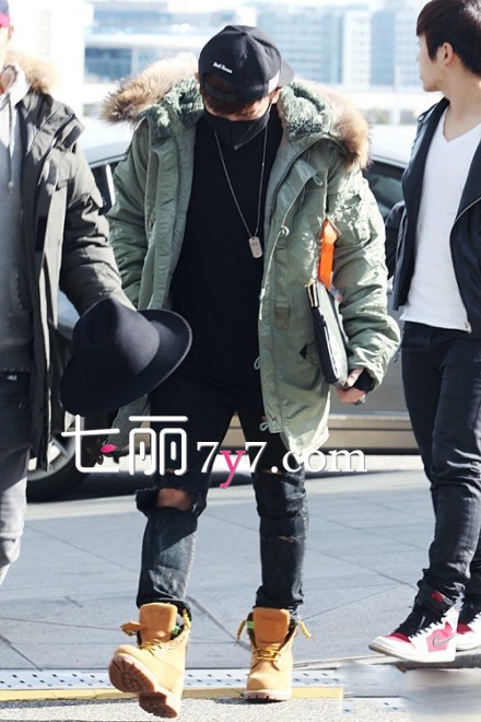 黑色的打底衣搭配绿色的棉服,欧巴!你冷吗?冷的话为何还要穿破洞牛仔裤,好吧,就算是为了耍帅粉丝们接受。酷酷的口罩遮住脸了,不过粉丝还是能从人群中一眼认出你。