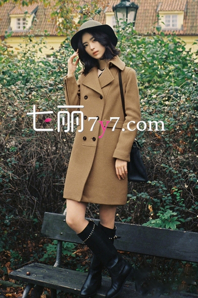 褐色呢子大衣外套,版型简单而大气,经典的双排扣设计,复古的口袋及小翻领,都呈现出浓浓的怀旧风情。搭配黑色高筒靴,适当的露腿,既时髦又不会觉得太冷。用一顶灰色宽檐帽凹造型,瞬间充满了甜美清新的感觉,非常优雅。