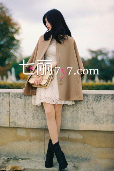 驼色呢子大衣外套,流线流畅,宽松的版型简约又不乏时髦感,采用个性时尚的落肩设计,让简简单单的大衣看起来带点斗篷款式,很有名媛风的感觉,内搭白色蕾丝连衣裙,再配上一双高跟短靴,精致华丽,看起来柔美动人。