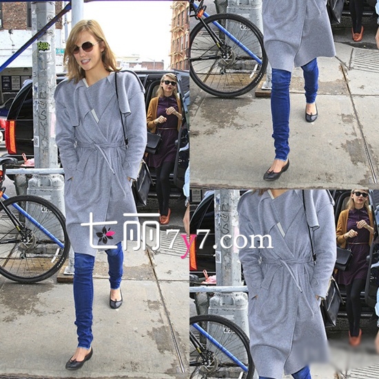 时尚点评:卡莉·克劳斯(Karlie Kloss)身穿烟灰色系带大衣搭配水洗深蓝牛仔裤,搭配腰带,让身材更加的苗条起来,完全没有冬天穿衣服的臃肿感觉,简约的搭配显得参差感十足。